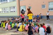 A keď už deti získali dostatočné poznatky a informácie ako poskytnúť prvú pomoc, prišla na rad rozprávka. Najskôr prišiel do átria školy medzi deti tancujúci maskot zajačik a zakrátko sa pripojil aj veselý vlk. Prostredníctvom krátkeho príbehu, ako sa zajačikovi urobilo nevoľno a odpadol a vlk mu poskytol prvú pomoc, rozpovedali rozprávku. Vĺčikovi sa zajačika podarilo oživiť a v závere akcie si spoločne s deťmi zatancovali. Na konci besedy každé dieťa dostalo pamätný diplom z poskytovania prvej pomoci, dostali sme aj krásne materiály a bol aj priestor odfotografovať sa s vlkom a zajacom.