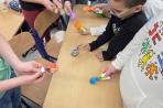 Deti tvorili maľované kraslice pomocou techniky obtláčania fixkou vyfarbeným obrúskom a vyrábali veľkonočnú girlandu so zajačikmi a vajíčkami.